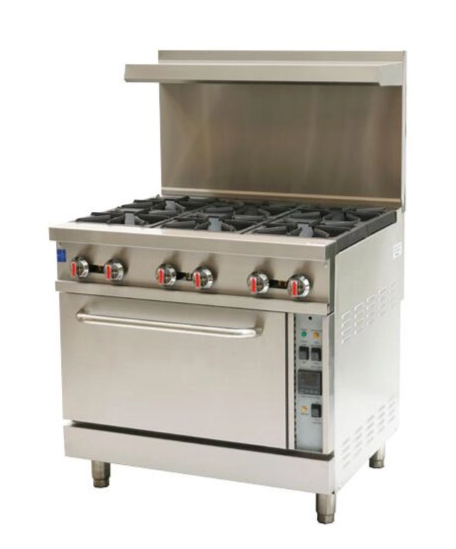 View full detailsGas 6 burners with griddle and oven Fully MIG welded frame for stability Stainless steel front, back-riser, galvanized sides 6" stainless steel ad...